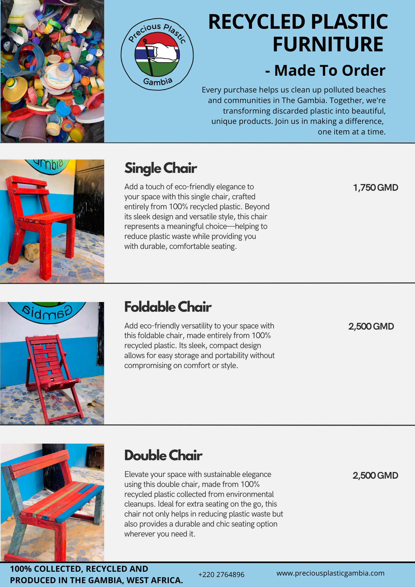 Are you looking for furniture to decorate your garden, office or home? Then custom-make your own style of recycled furniture to support our sustainable business, aimed at tackling plastic pollution in The Gambia.
